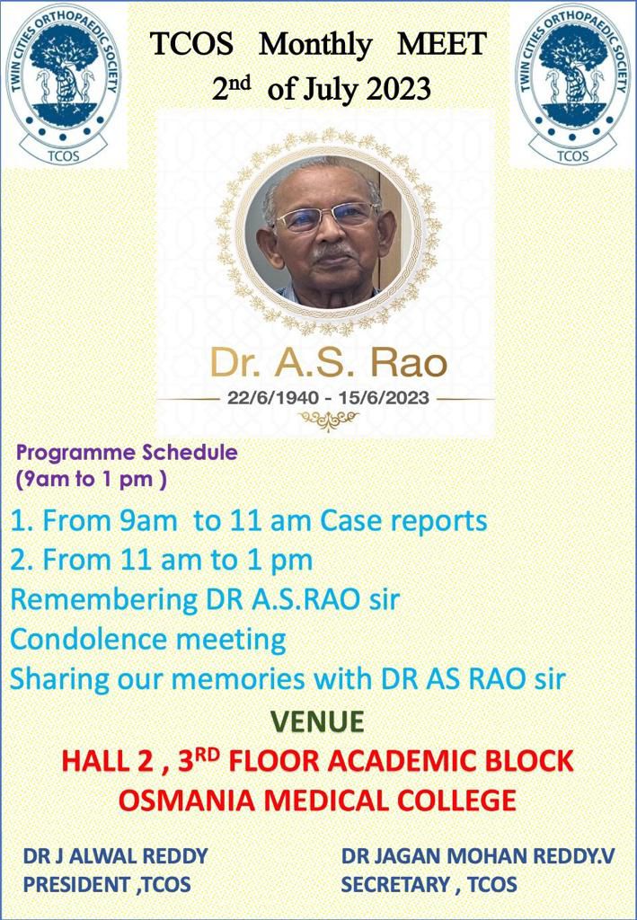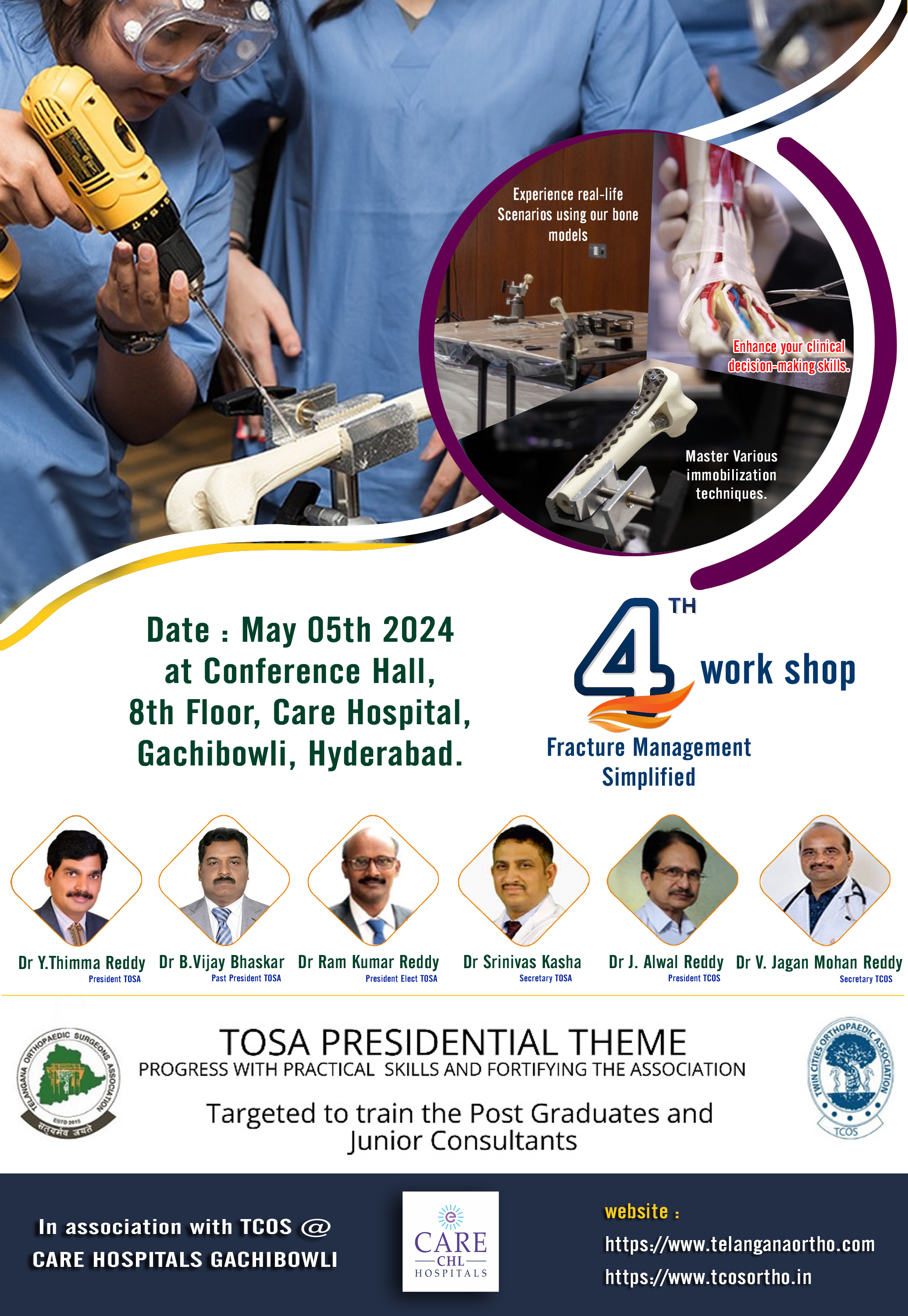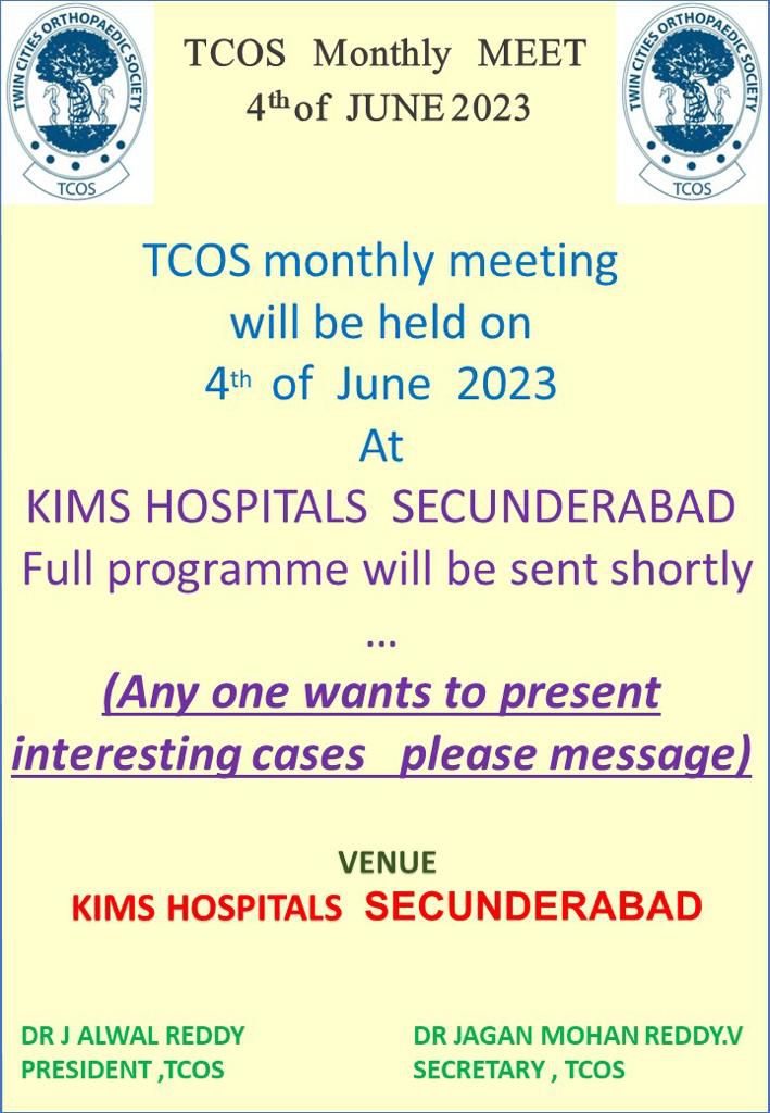 The Twin Cities Orthopaedic Surgeons Society (TCOS) is a prominent voluntary organisation dedicated to serving the orthopaedic community in Hyderabad and Secunderabad, Telangana, India. Established by a group of dedicated orthopaedic surgeons and resident doctors, TCOS functions as a vital platform for collaboration, knowledge sharing, and professional development within the field.