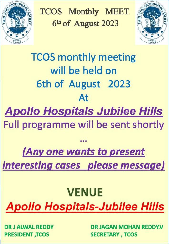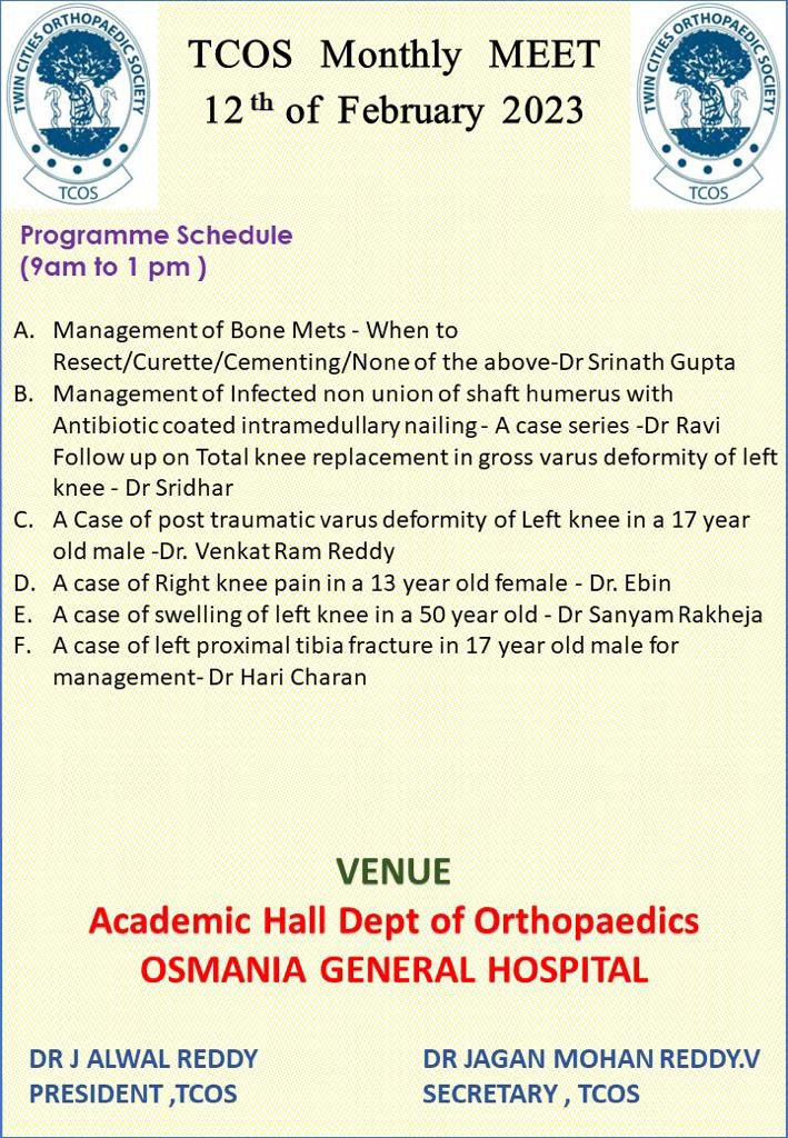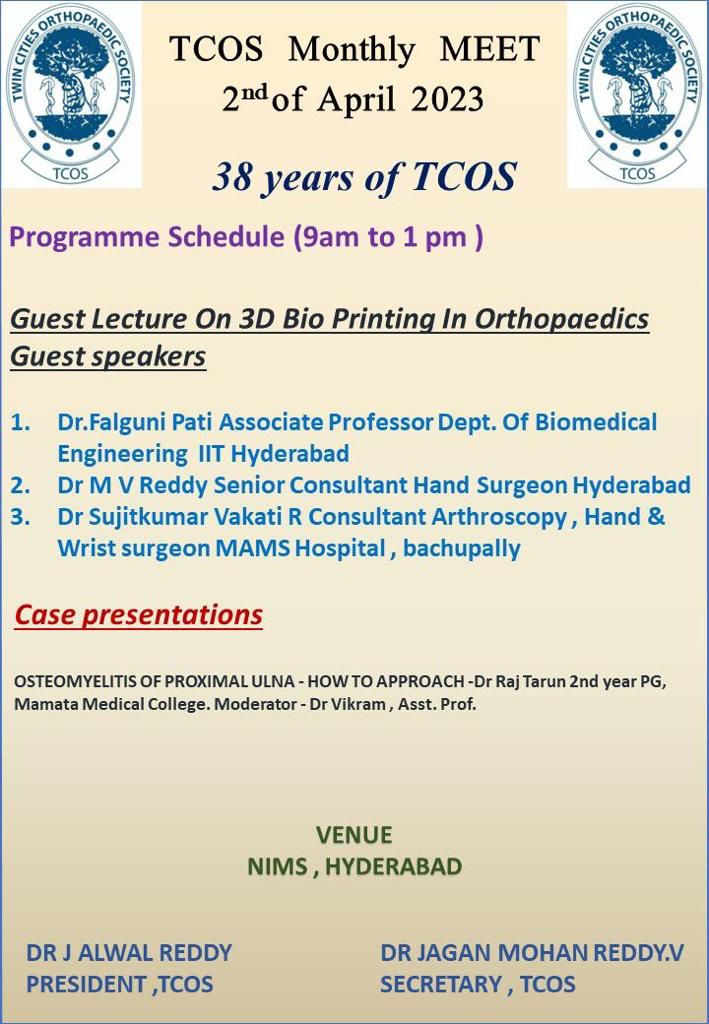 The Twin Cities Orthopaedic Surgeons Society (TCOS) is a prominent voluntary organisation dedicated to serving the orthopaedic community in Hyderabad and Secunderabad, Telangana, India. Established by a group of dedicated orthopaedic surgeons and resident doctors, TCOS functions as a vital platform for collaboration, knowledge sharing, and professional development within the field.